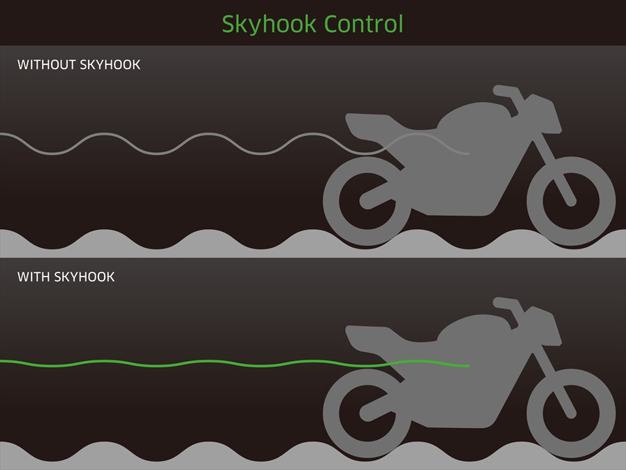 外観はカラーリングの変更や、TFTモニターのレイアウト変更などが施されただけで2020年モデルがもつ完成度の高さを継承している。今回びっくりしたのは、先述したスカイフックテクノロジーを入れたサスペンションなのだ。