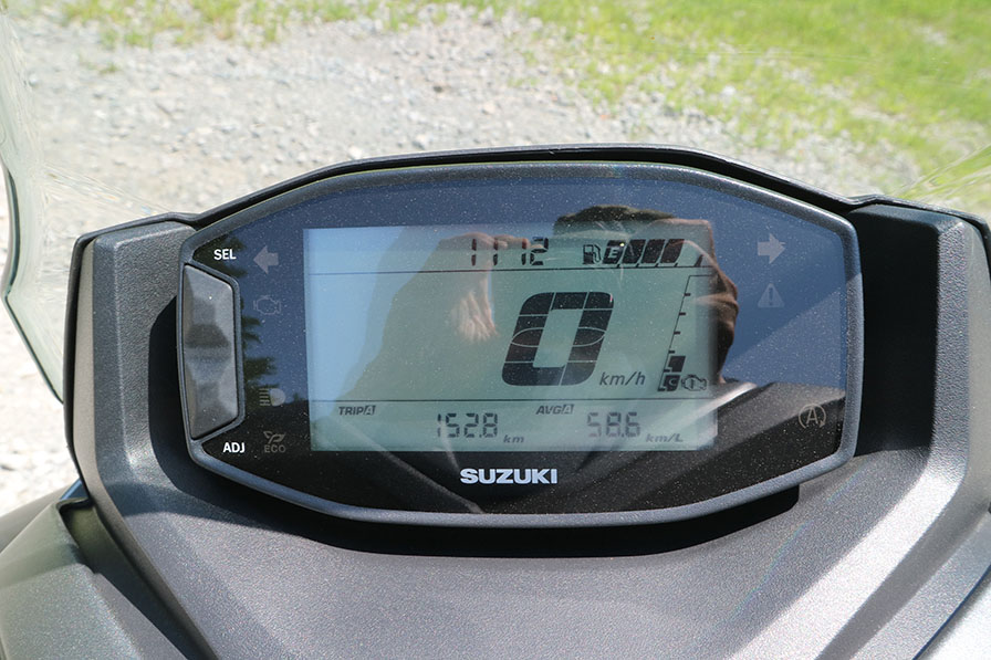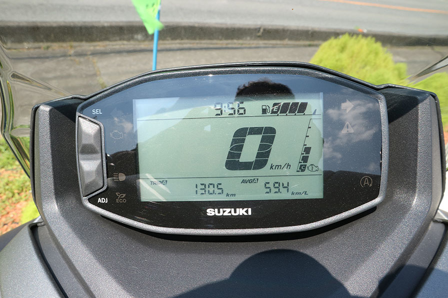 試乗車をお借りしてから3日間は通勤で使用した。自宅からアームズマガジン編集部までは国道20号線を走って片道約13㎞。いつも午前9時過ぎに自宅を出発するのだが、夏場は毎日のようにそこかしこで渋滞している。ストップアンドゴーの繰り返しだと、アイドリングストップシステムが作動する直前で走り出したりすることがありもどかしさを感じることもなった。帰宅時は渋滞がほとんど発生しないのでアイドリングストップシステムの恩恵を感じる時もあった。結局、ツーリングに出発する直前まで124.2㎞走行して給油量は2.50リットル、リッター49.7㎞となった。メーター上に表示されている平均燃費リッター53.8㎞(偶然WMTCモード値と同じだった)よりも悪い数値になってしまった。それでも渋滞の中を走ってリッター50㎞に近い数値は上出来だろう。
