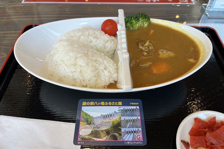 八ッ場ダムが完成するまでの長い道のりに思いを馳せつつ川原湯温泉駅をあとにして不動大橋を渡り、国道145号線沿いにある「道の駅 八ッ場ふるさと館」に向かった。人気スポットとあって多くの観光客やライダーが訪れている。ここで「八ッ場ダムカレー」を食べた。「道の駅 八ッ場ふるさと館」で一服後、八ッ場ダムに向かった。川原湯温泉からも見えてダムで堰き止められてできた八ッ場あがつま湖はエメラルドグリーン色の水を湛えている。周囲の山々の景色と相まって風光明媚な場所だ。