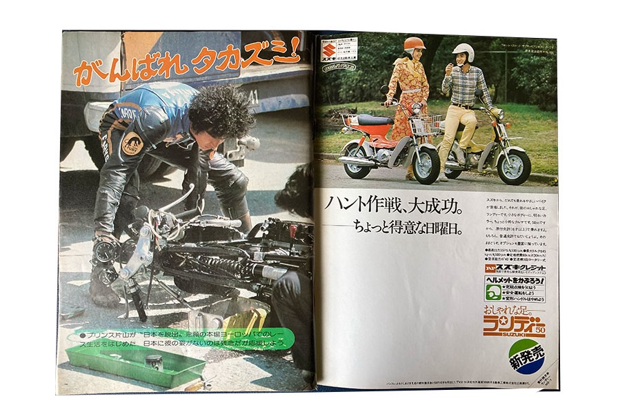 巻頭カラーは「がんばれタカズミ!」です。ヤマハのGP撤退によりプライベーターとして世界GPにチャレンジを始めた若き片山敬済氏を、これまた若き頃のレース写真大家の木引繁雄先生が撮っています。この頃のレース写真って、ピントが合っていなかったり、ブレていたりするものが平気で使われていたりするのですが、いい絵をガッチリ押さえています。さすが木引先生。70〜80年代の海外レース写真が今も見られるのは、木引先生のおかげなのです。BGも山ほどお世話になりました。