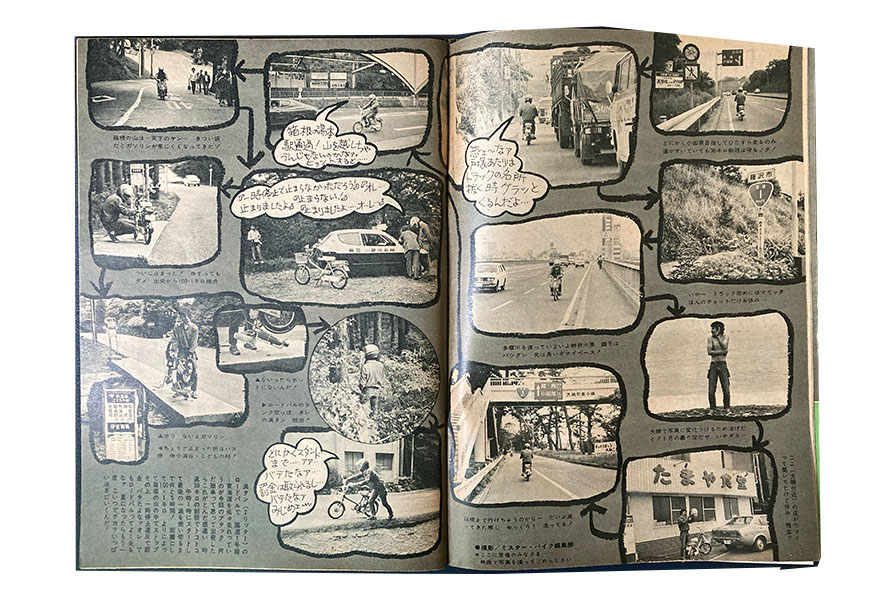 その次はロードパル満タンでどこまで行けるかというチャレンジ企画。原付で遠くまで走るという、ミスター・バイクの名物企画の記念すべき第一回です。5時間かけて2リッターで100km走っています。 一時停止違反でキップ切られたりしながら平均時速20km/hですから、ロードパルにしては速いですよね?