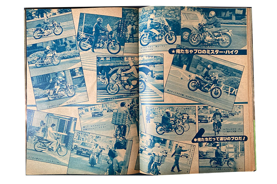 真ん中のモノクログラビアは「俺たちゃプロのミスター・バイク」。働くバイクを勝手に撮っています。昭和暴走族仕様の代名詞となった社旗棒、布垂れ風防はプレスライダーが元祖。社旗をなびかせて颯爽と走るプレスライダーは憧れの職業で、大手新聞社やテレビ局の社旗を出していると、白バイなら多少の違反は見逃したという話や、追い回されて新聞社の駐車場に逃げ込んだとか、県境まで逃げて助かったとかいう噂も聞いたことあります。あ、白バイで思い出しました。編集部に出入りしていたS君(励ましありがとうございました)、一時停止違反かなにかで白バイに追いかけられました。非力なCB250RS-Zで見事にぶっちぎりましたが、後日、白バイが編集部に来て……その先は覚えていないことにしておきます。覚えているのは、白バイ隊員が話込んでいる間、白バイに跨がって遊んでいたら戻ってきた隊員にこっぴどく怒られたことくらいです。