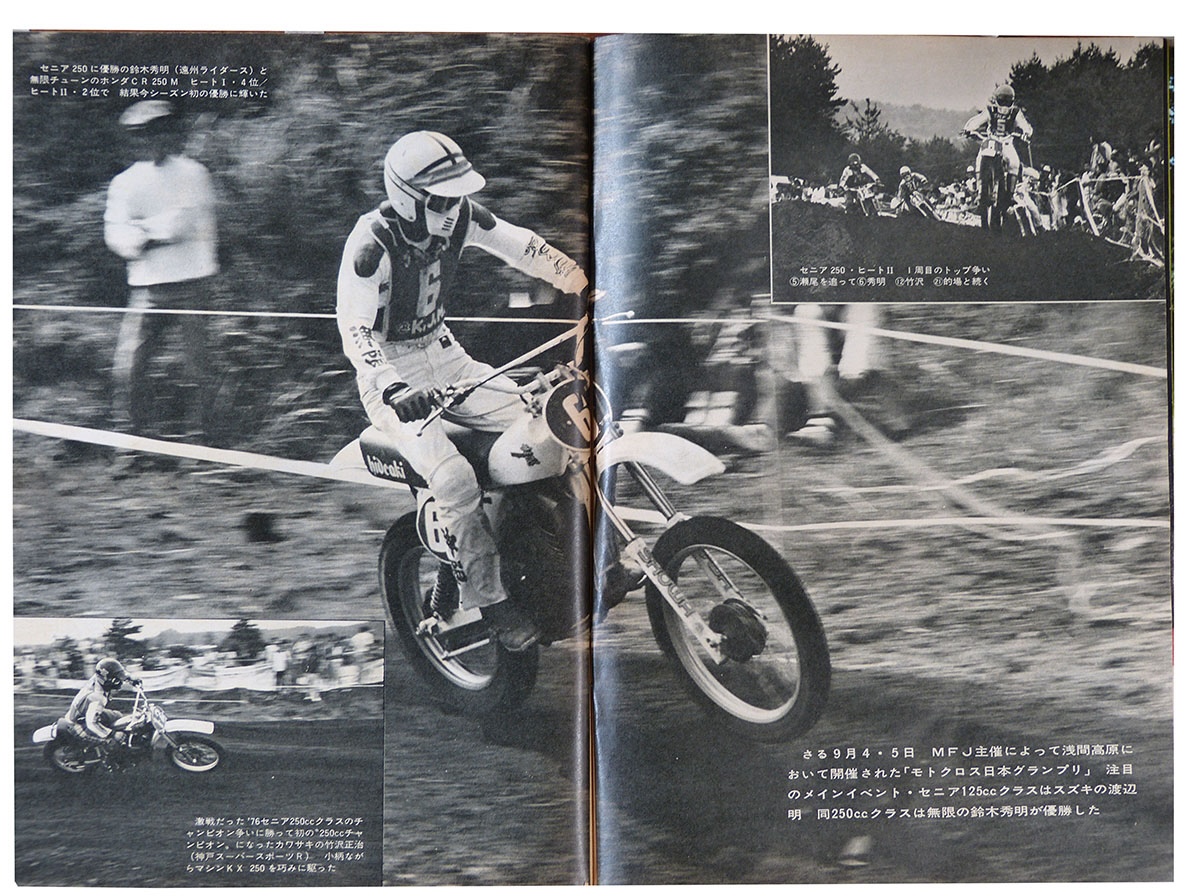 モノクログラビアは全日本モトクロス、第13回日本GPを5ページに渡って特集。当たり前ですが昨今のモトクロッサーと比べようもない、シンプルなモトクロッサーが躍動的で素直に格好いいと思います(オフは特にちんぷんかんぷんのため、当たり障りのない逃げ口上)。先月号から始まった(んだっけ?)のミスター・ライダーは、誰が言い出したのかシャケさんこと河崎裕之氏(その真相はてっぺーさんが主筆のSOB 20号で解き明かされています)。「女」も継続中で、今回はイタリアのパツキン美少女(死語というか、今ではアウトでしょうか)です。