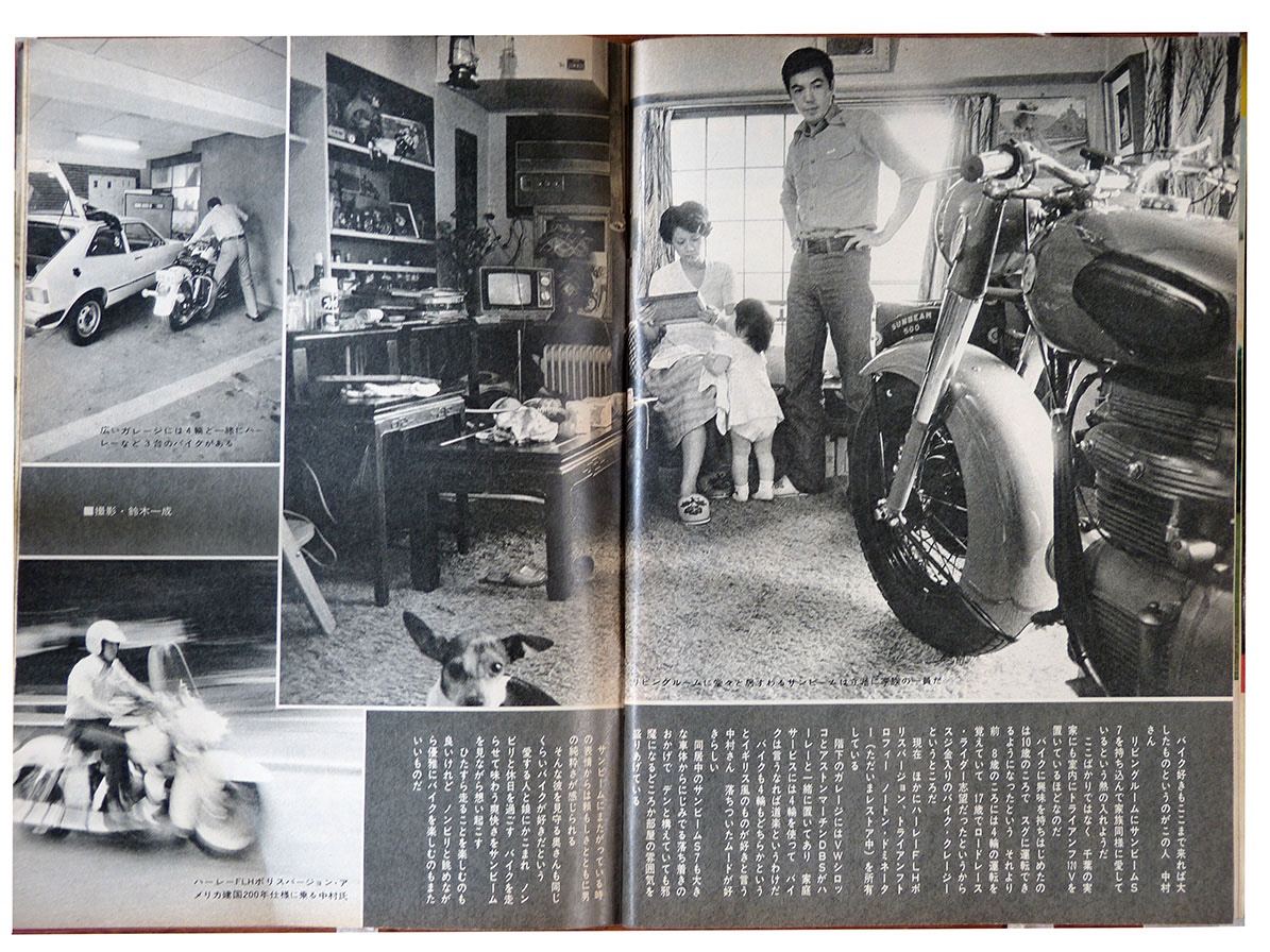 後半のモノクログラビアは、バイクを部屋に持ち込んでいる方を紹介。今も昔も日本の住宅事情ではやりたくても出来る人は、よほどの酔狂(4畳半のアパートにGB400を持ち込んでカスタムしていたフリーターもいました)か大金持ち。一般的には夢のまた夢です。