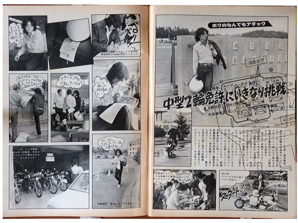 ラストを飾るのは「ボクのなんでもアタック 中型2輪免許にいきなり挑戦」というミスター・バイクっぽい企画がやっと登場。挑戦するのは現東京エディターズ代表取締役社長の中尾祥司氏。ご覧のようにエディターズイチのお洒落ボーイです。先々月号のレース3位入賞で天狗になったのか、特段の準備もなくくわえタバコのなめきった姿勢で挑戦しています。若さ故〜♪ の勢いは大して驚くことではありません。驚いたのは試験場で撮影しまくっていることです。正式に取材を申し込んだのか、いや、テレビ新聞ならともかく、当時は敵対関係になりつつあったバイク雑誌なんかが申し込んでも、まず許可は出ないでしょう。