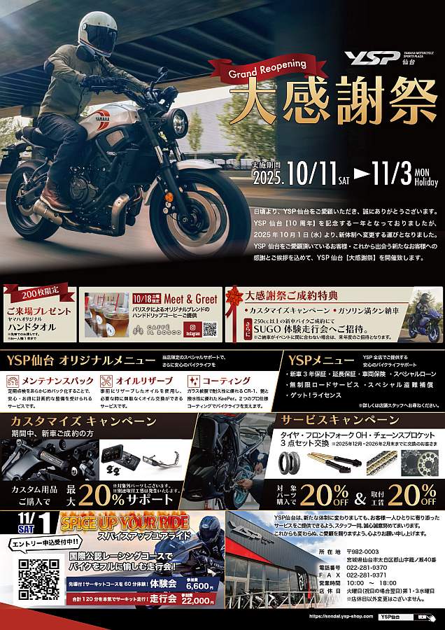 ブランドコンセプトを体現するヤマハスポーツバイク専門店としてグランド・リオープン。今回のリオープンを機に、従来からの信頼と実績をさらに強化、地域に根ざした店舗として一層のサービス向上を目指すという。10月11日(土)から11月3日(月・祝)までの期間は「大感謝祭」 を開催。来場特典として「ヤマハオリジナルハンドタオル」の先着200枚限定プレゼント他、成約特典、カスタマイズキャンペーン、サービスキャンペーンを実施。10月18日(土)には人気バリスタによるハンドドリップコーヒーの提供イベント「Meet & Greet」も開催。
