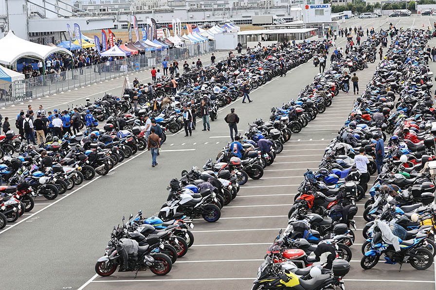 歴代モデルから最新未発表車まで、跨り可能なニューモデルとマシン展示の多さが目立った。それに隣接してGSX-R1000Rのエンジンを始め機械展示も充実した。開場からオープニング前のひととき、まずはそれらをじっくり見てまわって、出展ブースを順に訪ねながらGSX一色の雰囲気に浸る。気がつけば駐輪場エリアはバイクでびっしり埋め尽くされていた。あちこちで再会の笑顔があふれる。いよいよ今年も始まるという期待感高揚感に誰もがワクワクを抑えられない。