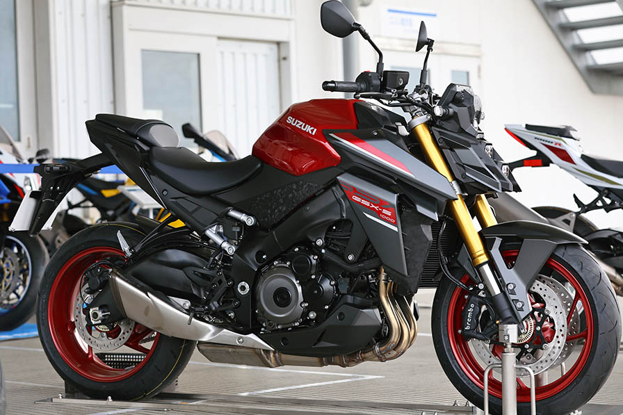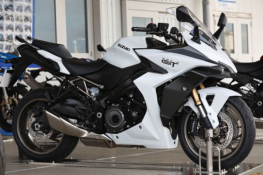 初めて見る色? と思ったらやはり国内未発表、赤いGSX-S1000、白いGSX-S1000GTがさり気なく展示されていた。