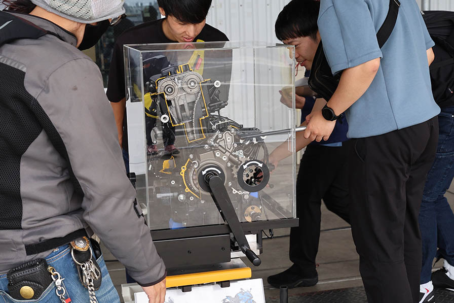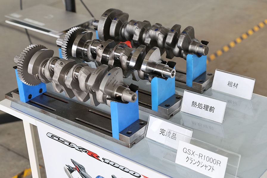 GSX-R1000Rのエンジン展示は手回しハンドルで機構がわかり大人気。クランクシャフトは『素材・熱処理前・完成品』の3段階展示というゴージャスな展示。