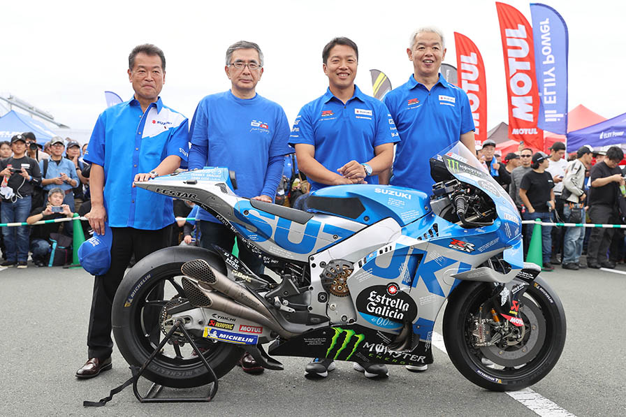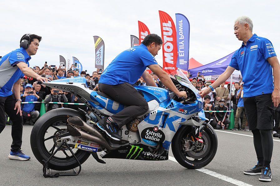 突然のGSX-RR登場、それだけでもすごいことだがさらにエンジン始動。スズキMotoGP活躍の記憶が思い起こされる音だった。