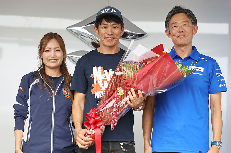 今季全日本ロードレース最終戦をもって現役引退を発表した生形秀之選手にもスズキから粋なサプライズが。奥様からの花束贈呈と愛のメッセージに生形選手おおいに照れる。ブースでは鈴鹿8耐を盛り上げるべく主催する『いす-1GP 静岡大会』をアピール。