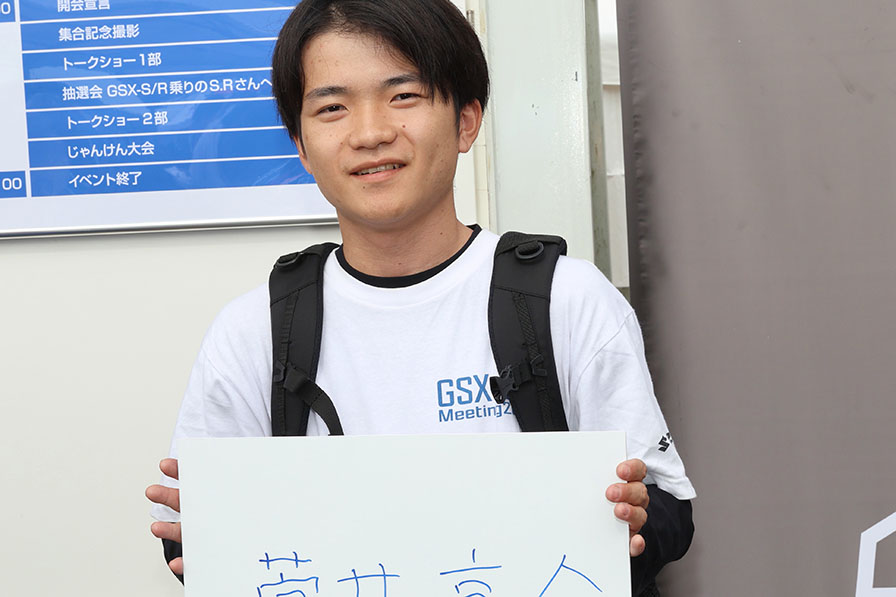 「ずっとスズキ乗りでバイク歴16年、この8Rは青色がかっこいいのが決め手になり買って1年余りになります。とても軽くて扱いやすいバイクです。ミーティングは普段会わないスズキのバイク乗りと会えるのが楽しいですね」