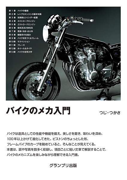 1999年5月刊行版をベースにカバーデザインを一新、ファンの要望に応え刊行。図や写真を数多く収録し、バイクの構造をわかりやすく解説、バイクのメカニズムを楽しみながら理解できる入門書で、初心者をはじめ、近年増加しているリターンライダーもメカニズムを復習するのに最適。つじ・つかさ著。A5判、並製、213ページ。2,640円。