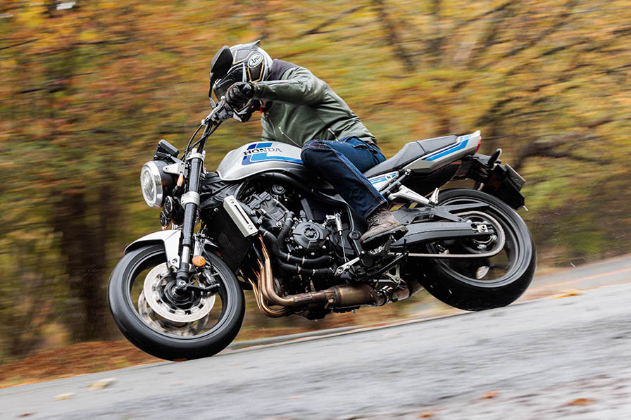 そういった難しい状況で生きるのはやはり余裕のあるポジションと足着き性。こういった要素が自信を持たせてくれ、フルウェット路面でも怖がらずに走ることができた。取り回しも、ハンドル切れ角そのものはホーネットと同じはずなのに、大アップハンドルのおかげかUターンがとてもしやすく、その点でもビッグネイキッドらしい自在さを実感できた。