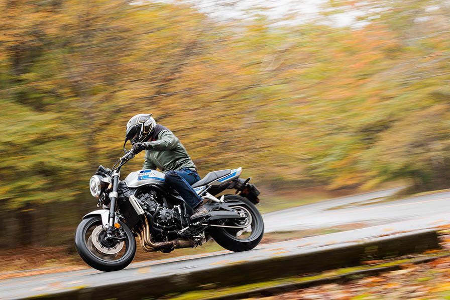 特に感じ入ったのは、2車線以上の幹線道路における6速固定での使いやすさ。ペースもそれなりに速い中、3000rpmあたりでシフトダウンせずにビューゥビューゥと車の間を抜け、労せず加速できるのは本当に気持ちがいい。この時の感覚はまさにビッグネイキッドでありCB1300SFに近い。潤沢なトルクはCB1300SF比で300㏄も少ないとは思えないほどで、車体の軽さもその排気量差を補ってくれているだろう。