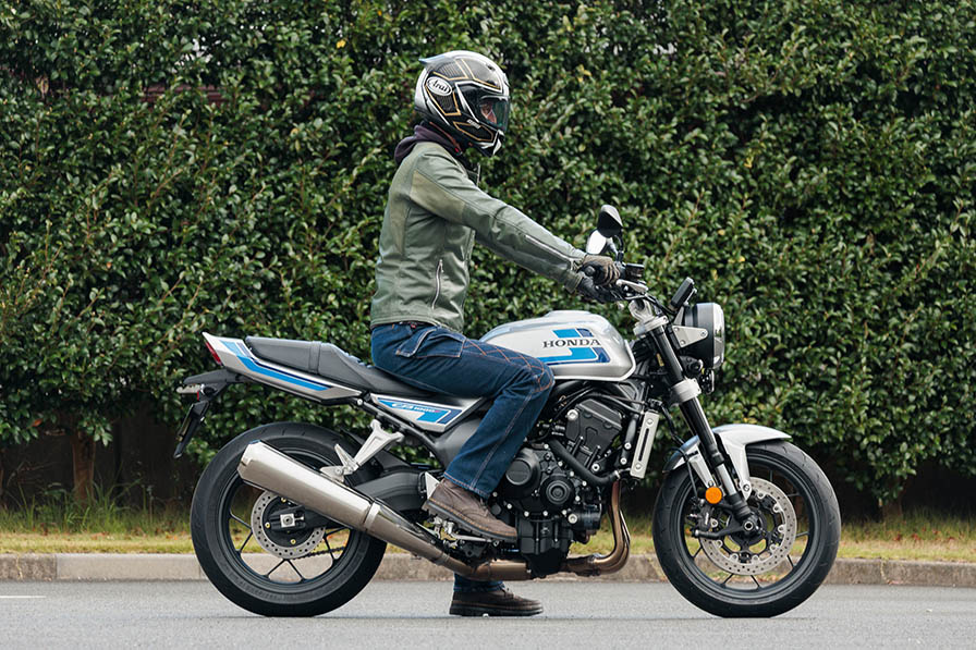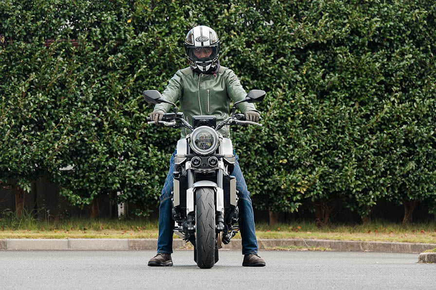 シート高は795㎜。シート形状も考慮されているし、サスペンションの初期沈み込みもソフトなため足着きは非常に良好。左側はふくらはぎがサイドスタンドを出すためのステーに当たるという人もいたが、慣れの範疇に思う。ハンドルは大アップハンであり非常にラクチン。おかげでハンドル切れ角はホーネットと同様にもかかわらず、Uターンはとてもやりやすかった。着座位置はホーネット比で38.5㎜後退し、それに合わせてステップ位置も変更されとてもナチュラルなものに。その殿様ポジションっぷりはCB1300SFよりも楽に感じるほどだ。そしてCB1300SFと比べて圧倒的に軽いというのが大きな魅力。取り回しがスイスイできるため、ガレージから出してきて乗るまでのハードルがとても低い。ライダーの身長は185cm。