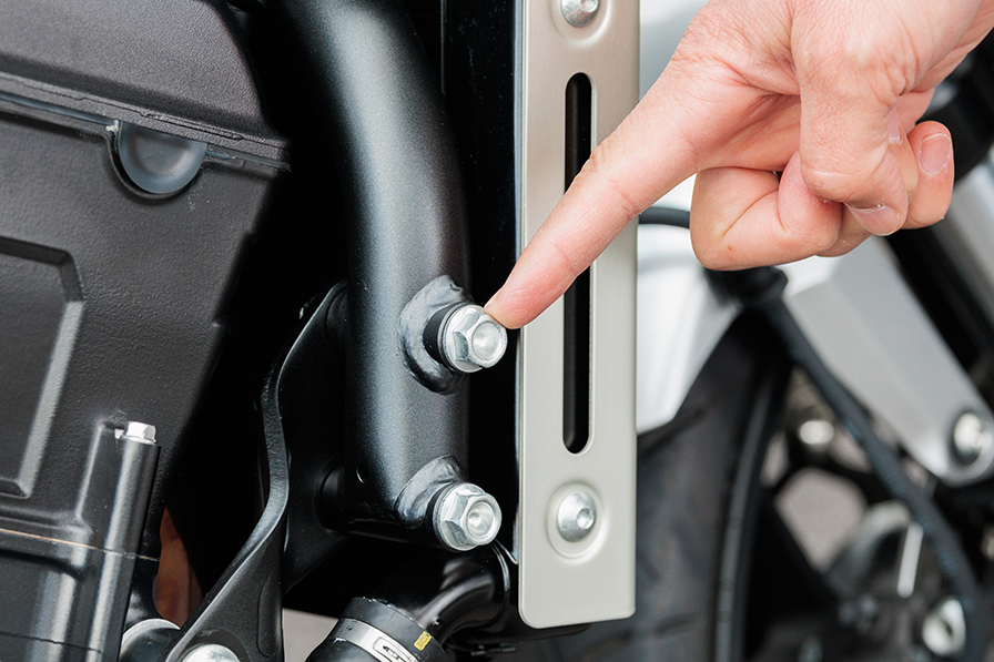 CBR1000RR由来のエンジンは124馬力までピークパワーが抑えられ、代わりに最大トルク発生回転数も下げられるというネイキッドの手法を取り入れた。ただそれだけではなく、さらに味わいを演出すべく、吸排気カムは気筒間でタイミングをあえてずらすという、あの空冷CB1100で採用された技術を搭載。これにより吸排気音やアクセルを開けた時のフィーリングに雑味が加わっており、さらに電スロによりアクセル開け始めで右手の入力に一瞬遅れて反応するような設定とされている。ちなみに筆者はこういった味付けに対し、「ちょっとやりすぎかな?」という感触だったのだが、一方で「これだけ面白くなるならもっと濃く味付けしてほしい!」というジャーナリストもいたため、やはり「味」というものはファジーなものだと再確認。市場の反応が楽しみである。なお、2枚目の写真はエンジンとフレームの締結ボルトだ。ホーネットとCB1000Fではかなり印象が違い、しなやかな乗り味となっているのだが、この締結ボルトの強度を落とすことで車体に対してエンジンがやや遅れて寝てくる、といった反応を狙っているとか。なんというファインチューニング!
