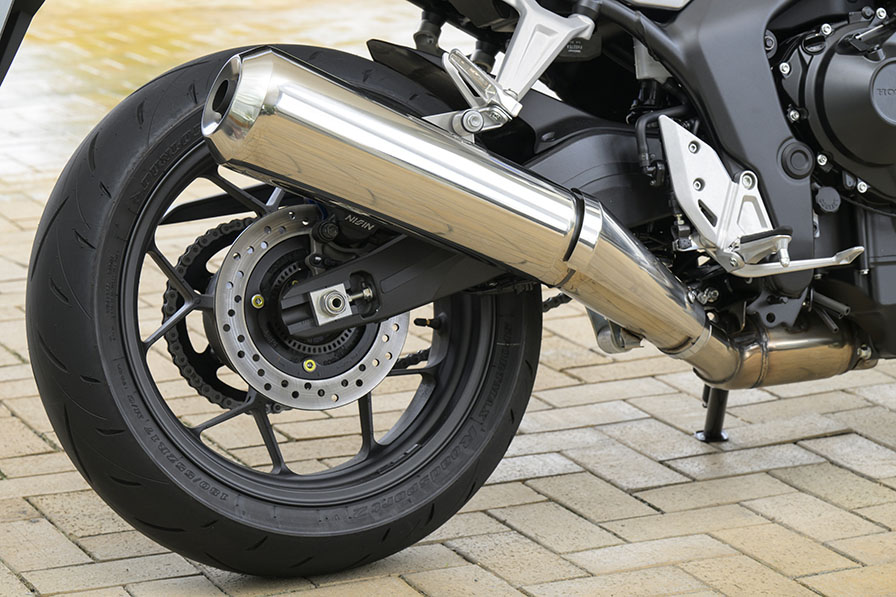 フロント周りはキャスター/トレール等数値はすべてホーネットと共通なのが驚きだ。それなのにホーネットよりもかなりしなやかで、難しい状況や極低速域でもソフトで確かな接地感を持っているのだ。フォークはスプリングは共通、内部ダンピングは変えてあるが、フルアジャスタブルのため締め上げていくことも可能。ブレーキはキャリパーやパッドに至るまでホーネットと共通だが、ホースだけはより拡張率の高い、柔らかいものに変更されている。試乗車のタイヤはブリヂストンS22。もう1つの銘柄はダンロップのロードスマート2で、いずれのブランドも専用チューニングが施されている。