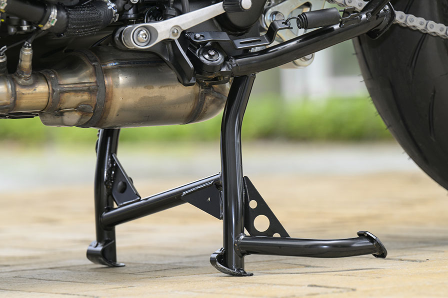 センタースタンドはアクセサリー扱いだが、兄弟車ホーネットにはそもそもセンスタ用のステーがないため装着不可。CB1000Fの性格上センスタを設定してくれたのはうれしい。なお価格も1万7600円と良心的。バランスが良いようで、センスタをかけるときの入力は最小限でスルリと上げることができた。