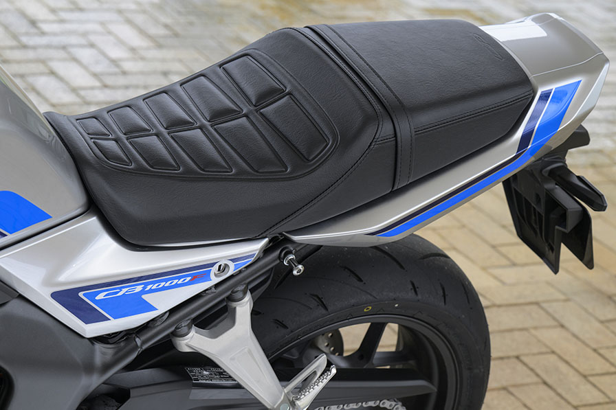 前後に長いタンクはそのカラーリングと合わせてかつてのCB750Fのイメージが強い。サイドから見るとその長さにベテランは「F」らしさを見出すだろうが、上から見るとなかなかボリュームがあることも個性に思える。惜しく思ったのはホーネットでは17Lある容量が、よりツーリングも楽しめそうなパッケージであるCB1000Fで16Lと減らされていることだ。なお急加速やハイスピード域ではタンク側面が滑ってニーグリップしにくくなってくるため、アクセサリー設定の「タンクサイドステッカー」を貼ることをお薦めする。