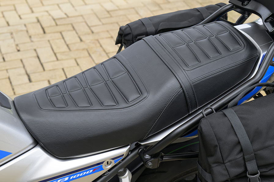 往年のファンが喜びそうな表皮のシートは座面が広く快適で、しかも前の方に傾斜しているとかいうこともないため長距離も対応するだろう。かつスポーティに走ろうと思えばスムーズな体重移動もできた。タンデム部は広く、荷かけフックも充実。テールカウルがあることも手伝い、タンデムも荷物の積載も安心だ。独立したヘルメットホルダーがなかったのは惜しいが、今やキーを使わないシンプルな社外品も多く出回っている。なお2枚目の写真はアクセサリー設定の「コンフォートシート」。ウレタン厚みを33㎜アップさせて快適性を追求。またがってみたところ確かに快適なのはもちろん、着座位置が上がるためよりスポーティに走らせることもできそうに思った。