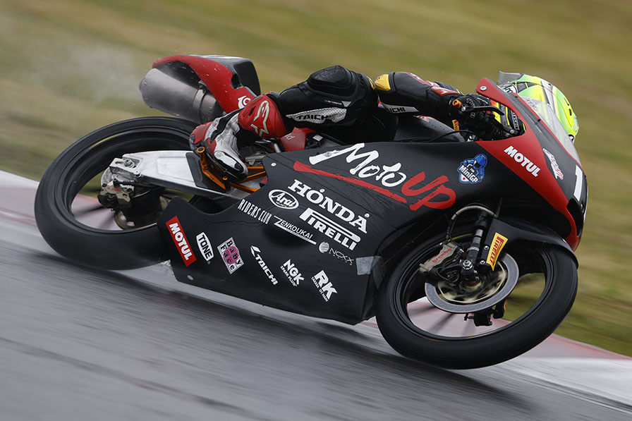 雨の予選でポールポジションを獲得したのは、#11中谷健心(MotoUP Jr Team)。決勝日も雨となり、朝のウォームアップランでは2番手に約3秒の差をつける走りでトップライムを記録する。一方の尾野は予選で転倒。マシンを修復し、緊迫した中でラスト1周のアタックで4番手タイムをマークするも、ペナルティによりそのタイムが抹消され、最後尾グリッドからのスタートとなる。