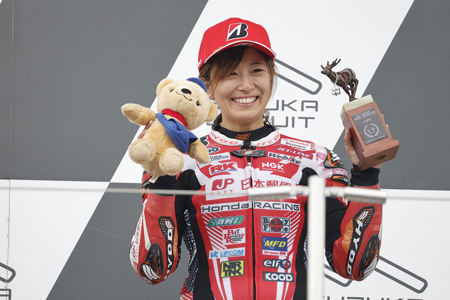 「小山選手のペースが予想以上で苦しかったですが、最終ラップは“シケイン勝負”と決めていて、それを実行できました。鈴鹿で初優勝できて本当に嬉しいです」