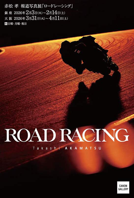月刊オートバイやロードレース専門誌・ライディングスポーツでお馴染み、今年は空前のブームであった1986年から2023年までのロードレースシーンで構成した写真集・ROADRACINGが発売されたフォトグラファー、赤松 孝氏の報道写真展「ROADRACING」を東京と大阪のキヤノンギャラリーで開催される。
