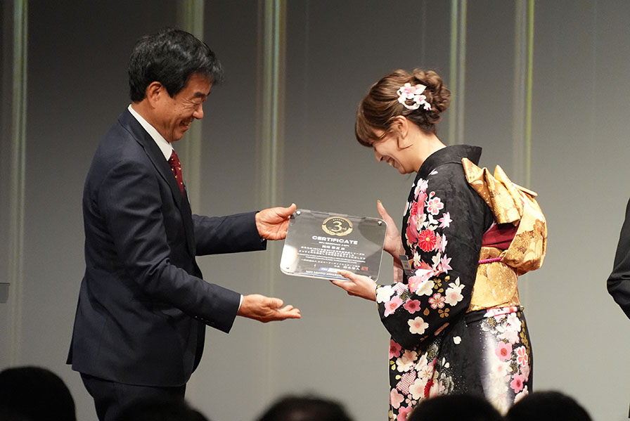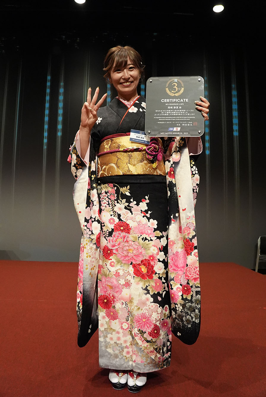 J-GP3クラスのチャンピオンは、5年連続となる尾野弘樹(Honda)。ランキング2位には後半戦で調子を上げた高校生ライダーの中谷健心(Honda)、3位には振り袖姿で登壇し華を添えた岡崎静夏(Honda)が入り、女性ライダーとして最上位ランキングを獲得した。