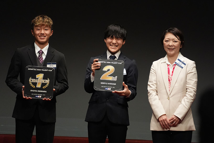 海外参戦功労賞には、アジア・タレント・カップに参戦しチャンピオンに輝いた萩原羚大と、ランキング2位の池上聖竜が選出された。未来のロードレース界を担う若手ライダーたちが、笑顔で壇上に立った。