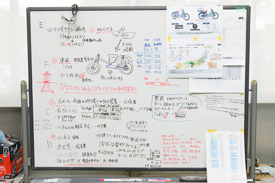 ホワイトボードには、作業手順や計画表を貼り付けて、メンバーが共有できるようにしていました。Webミスターバイクの取材についても書かれていました。