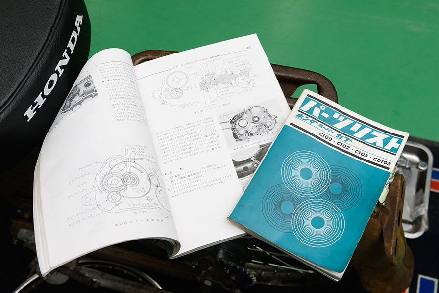 C100のサービスマニュアルとパーツリストは、使い込まれた状態。Hondaのサービス部門が協力して提供してくれた貴重な資料です。