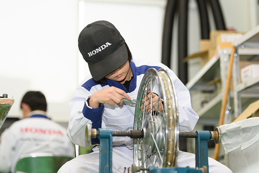 「横ブレと縦ブレ両方を調整するのは難しいですし、根気がいる作業です。今ではスポークホイールのバイクはオフロードマシンくらいになりましたが、ショックを和らげる仕組みが良くわかります。なぜこのような構造になっているのか、基本を知ることがこれからの仕事に役立つと思います」