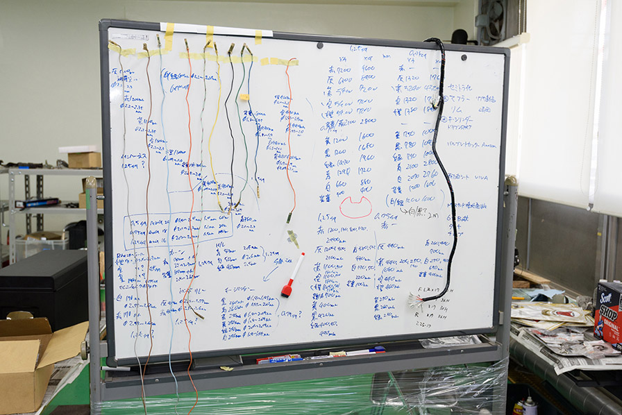 配線1本1本の長さを測って制作に取り組んだ様子が分かります。ボードの右側にぶら下がっているのが完成したハーネスです。