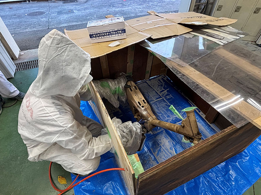 自作した特製ボックスでサンドブラスト作業。埃などが飛び散らない工夫です。
