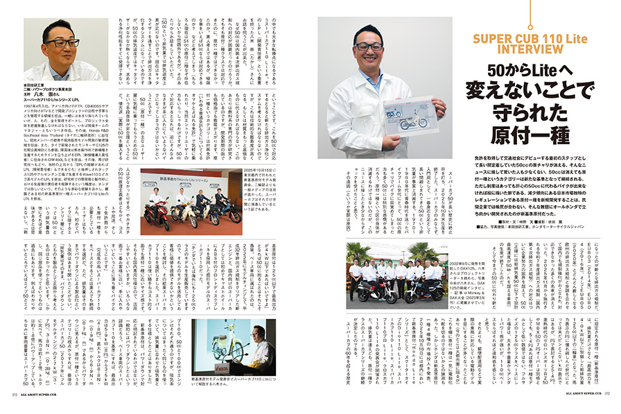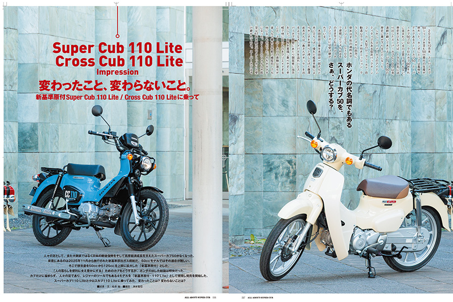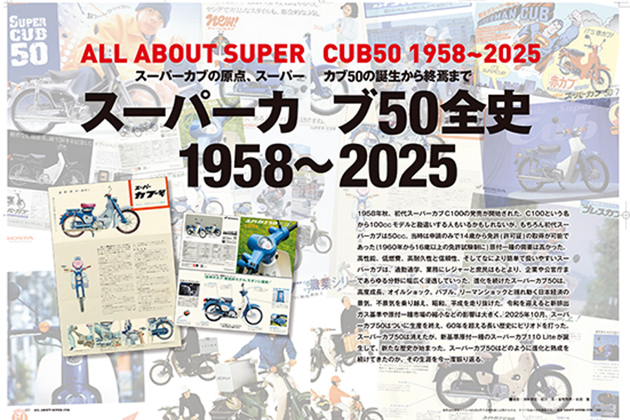巻頭特集は新基準原付のスーパーカブ110 Liteとクロスカブ110 Liteをモータージャーナリストの松井 勉さんが一番乗り試乗。思い出を交えつつ原付一種を語ります。また、好評の開発者インタビューは、新基準原付一種のスーパーカブ110 Lite、スーパーカブ50ファイナルエディション(再録)、リトルカブの開発スタッフにお話を伺いました。特にリトルカブのインタビューではおそらく二輪誌初掲載の二輪駆動試作車のエピソードもあり、カブファンは必見です。