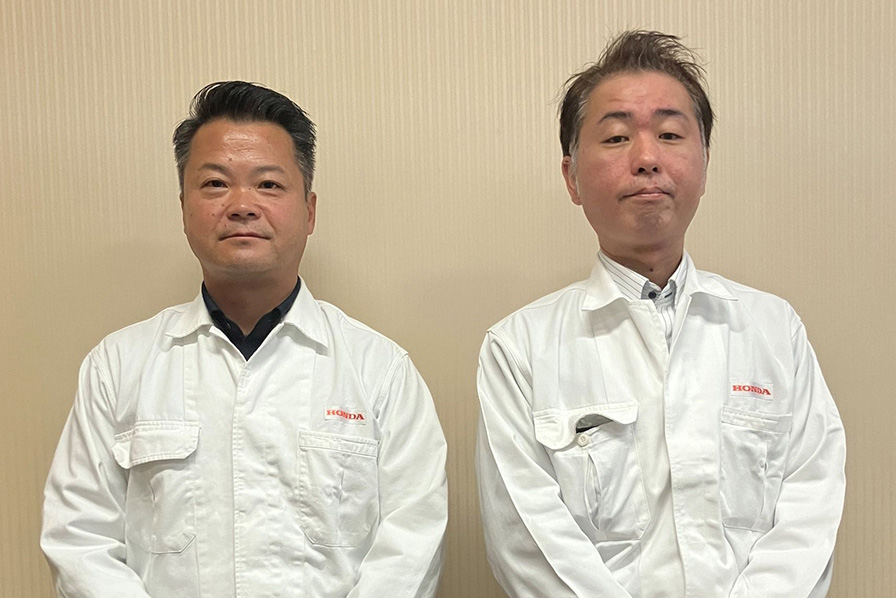 左が着任2シーズン目を迎えるHRCレース運営室長の本田太一さん、右が2015年からMotoGPの車体設計にかかわってきた、2025年モデルRC213Vの開発プロジェクトリーダーの辛島亮之さん。
