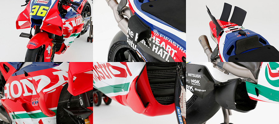 RC213Vの最新エアロパッケージ。フロントカウルとフロントフェンダーのウィングレット、センター&アンダーカウルのブリスター、テールカウルサイドとテールカウルのフィン、そして以前はスプーンと呼ばれていたスイングアーム下が1セットだ。