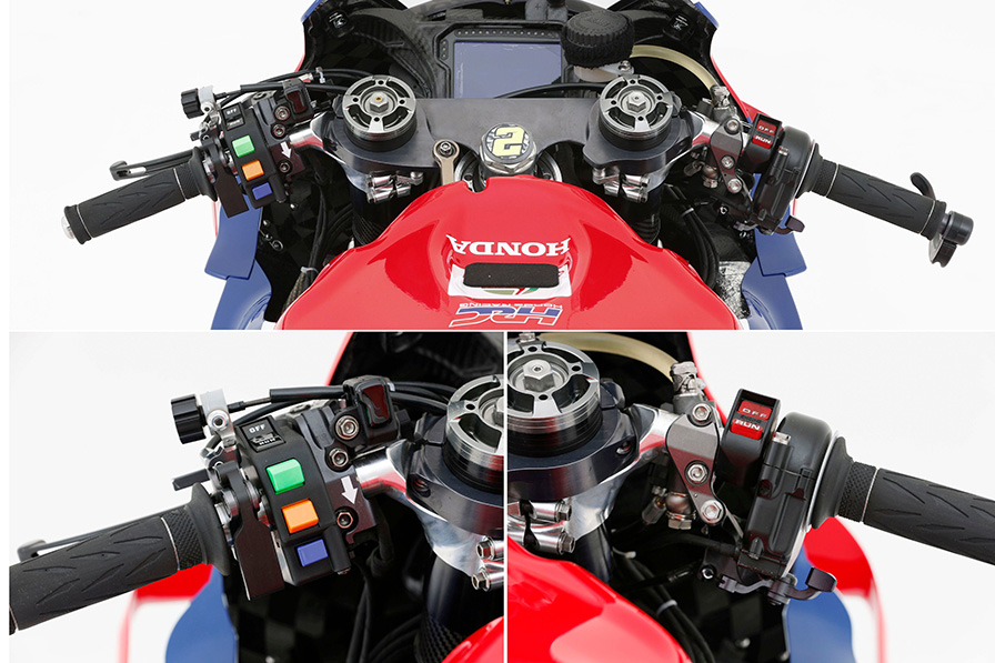 かつては厚みのあるトップブリッジが採用されていたが、近年は高剛性よりもしなりを求める形状に変化しつつあるようだ。左右ハンドルスイッチにはパワーマネジメントのモード変更ボタンのほか、ホールショットデバイスやライドハイトデバイスのレバーが備わっている。
