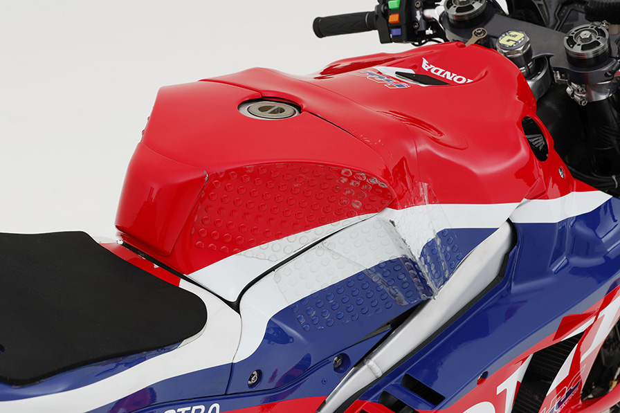 フューエルタンク上面と側面は、ライダーが全伏せ姿勢を取った時に上体と密着する形状に。面が直線からへこんでいる部分はライダーのヘルメット顎部分を乗せる場所と、両腕にフィットする曲面になっている。