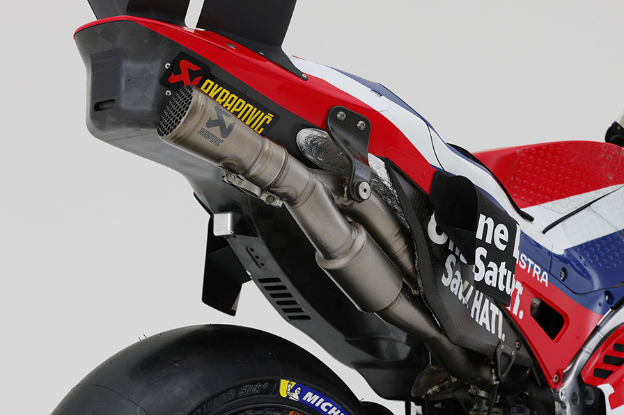 この数年のHondaのウィークポイントといえば、やはり加速とトップスピード。もちろん、この2点は単にエンジンのパワーアップをすればいいという問題ではなくて、パワーをいかに路面に伝えるか、いかに加速でのウィリーを最小限にとどめるか、と多岐にわたる課題。たとえばエンジンパワーは上げることができても、コーナー脱出でホイールスピンをするとパワー制御が働き、電子制御が出力を落としにかかる。するとタイムも出ないわけで、最高速も伸びない。これを試行錯誤して、なるべく制御が入らないパワー特性、そして加速時にいかにウィリーしないエアロダイナミクスを作るのかが、現代MotoGPマシンの大きな勝負のカギといっていい。ここをHondaはガラッと一変させたのだ。