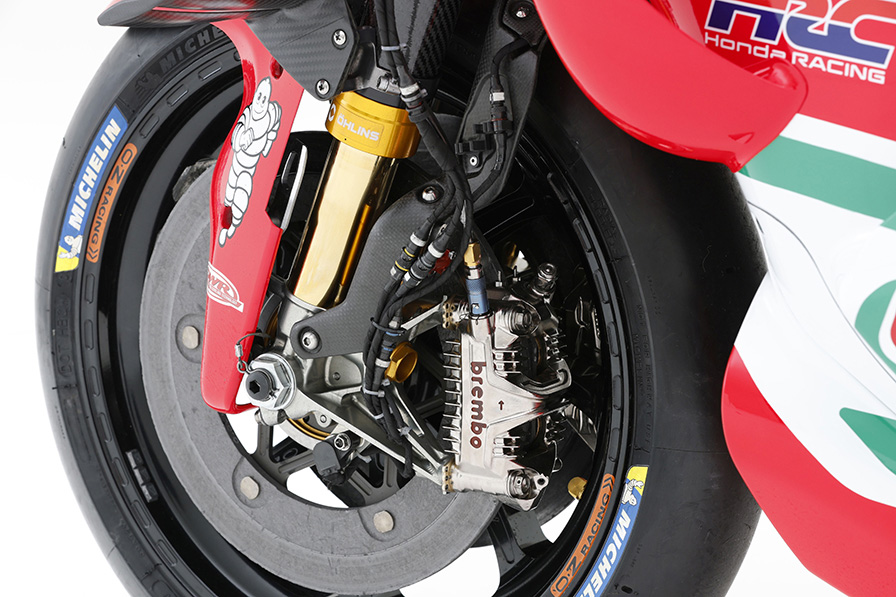 オーリンズ製カーボンフォーク、ブレンボ製カーボンディスク+アルミ削り出しのGP4と呼ばれるキャリパー。キャリパーの前面と背面に見えるのは冷却フィンだ。