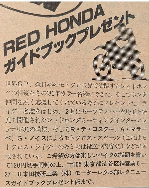 こちらは、1981年のモーターレクリエーションニュースに掲載された告知です。私がこのニュースの制作とプレゼントを担当していました。