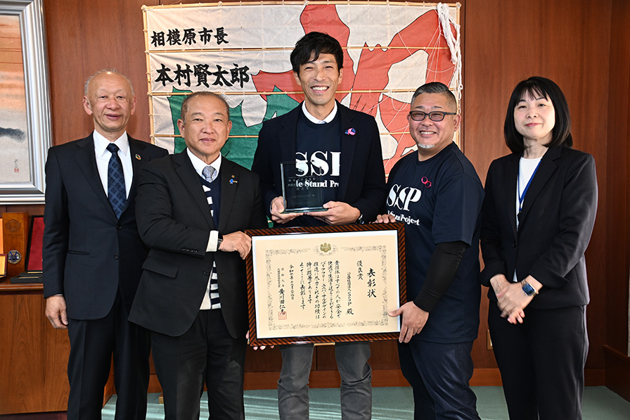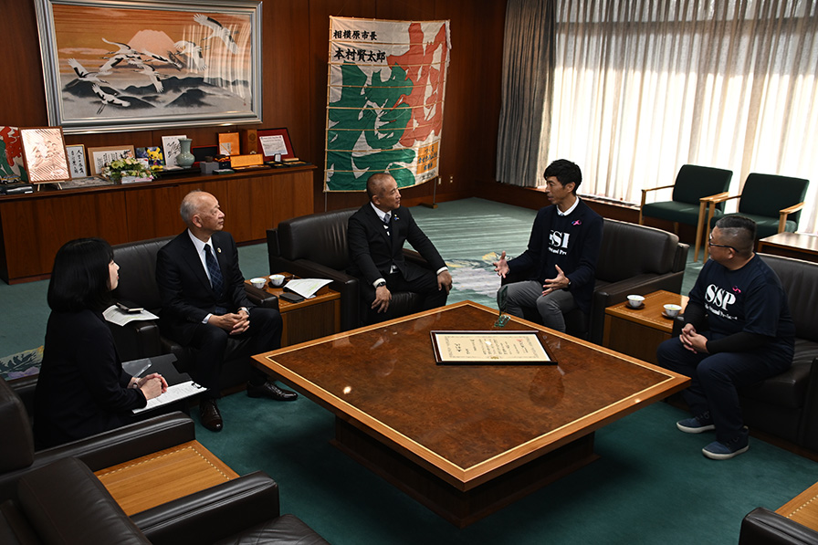 そして今回、公益社団法人SSPの青木治親代表理事と古木哲郎監事が、SSPの所在地である神奈川県相模原市の本村賢太郎市長を訪問、受賞の報告を行った。SSPは相模原市のSDGsパートナーでもあり、SSPのパラモトライダー体験走行会は、過去には、さがみ湖MORIMORI(旧 さがみ湖リゾートプレジャーフォレスト)や宮ケ瀬湖鳥居原ふれあいの館で開催の実績もある。またSSPライトではアリオ橋本や青山学院大学相模原キャンパスでも開催しており、相模原市との関係も深い。