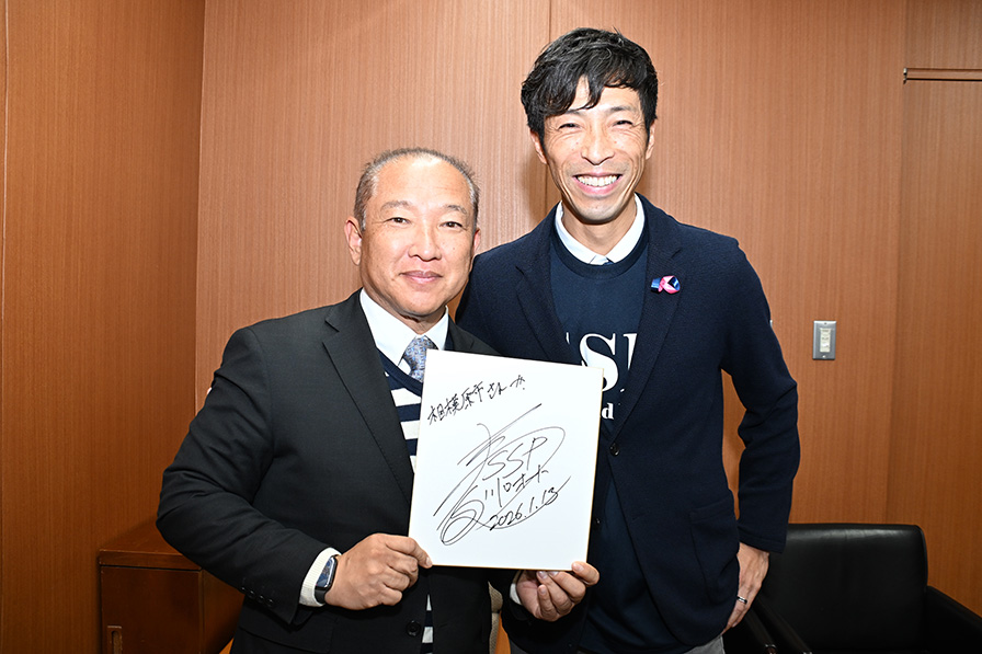 3期衆議院議員を務めた経験もある本村市長との話の中では、超党派の国会議員で構成されたバイカーズ議員連盟などの話も出て、市長からも「趣味というか、やっぱり好きなものはね、伝わるし、繋がるんですね」とコメント。元オートバイ乗りの石井賢之副市長も同席し、話は大いに盛り上がった。
