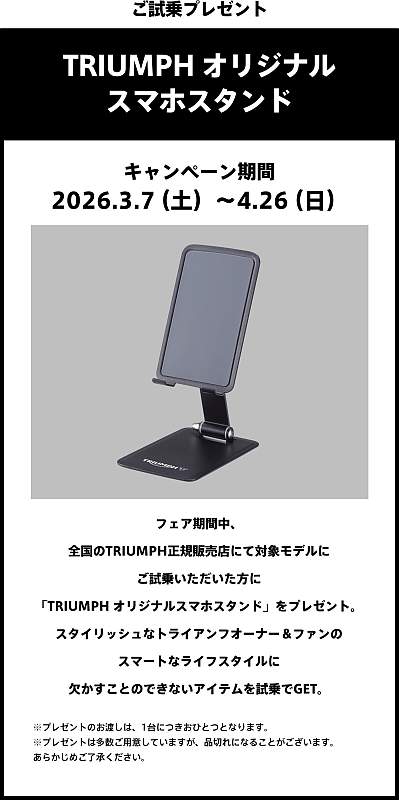 尚、対象機種を試乗した人には「TRIUMPH オリジナル スマホスタンド」をプレゼント(一人一点限り、数に限りあり)。フェアの詳細は下記URLより。