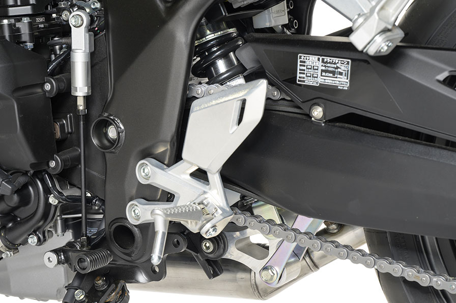 基本パッケージは、ダウンチューブを持たないダイヤモンドスチールフレームに水冷並列4気筒エンジンを搭載し、フロントフォークは倒立、リアサスは先代の2本サスから、リンク付きモノサスとなっています。シリンダーには先代のような冷却フィンこそ切ってありませんが、エキパイから集合部に至るまでのデザインが、まるでヨンフォアを思わせるようなきれいで流麗なラインを描いていますね。ラジエターつき、前傾シリンダーでこの曲線美を出すの、かなり難しいんです!